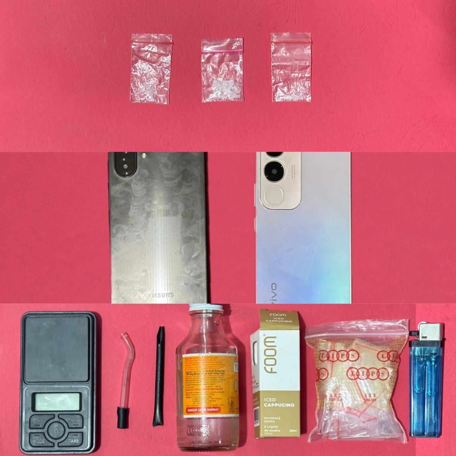 “Turut disita barang bukti dari pelaku RW dan RT berupa 3 paket plastik klip berisi sabu dengan berat bersih 0,57 gram, alat hisap sabu (bong), pipet kaca, sekop plastik dari sedotan, 1 korek gas, timbangan digital hitam, 1 buah kotak, 1 pak plastik klip serta 2 handphone ungu dan hitam” katanya.