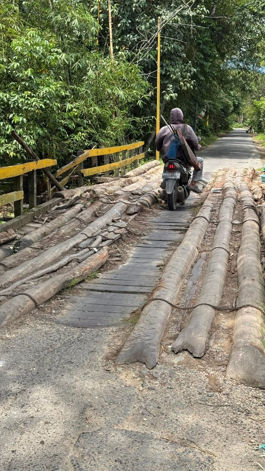 Diketahui, jembatan penghubung antara Desa Sei Durian dan Batang Banyu tersebut merupakan jembatan kayu ulin yang sempat digunakan sebagai lintasan alternatif karena jalan besar (jalan nasional) di Sungai Turak (HSU) longsor dan tidak bisa dilewati.